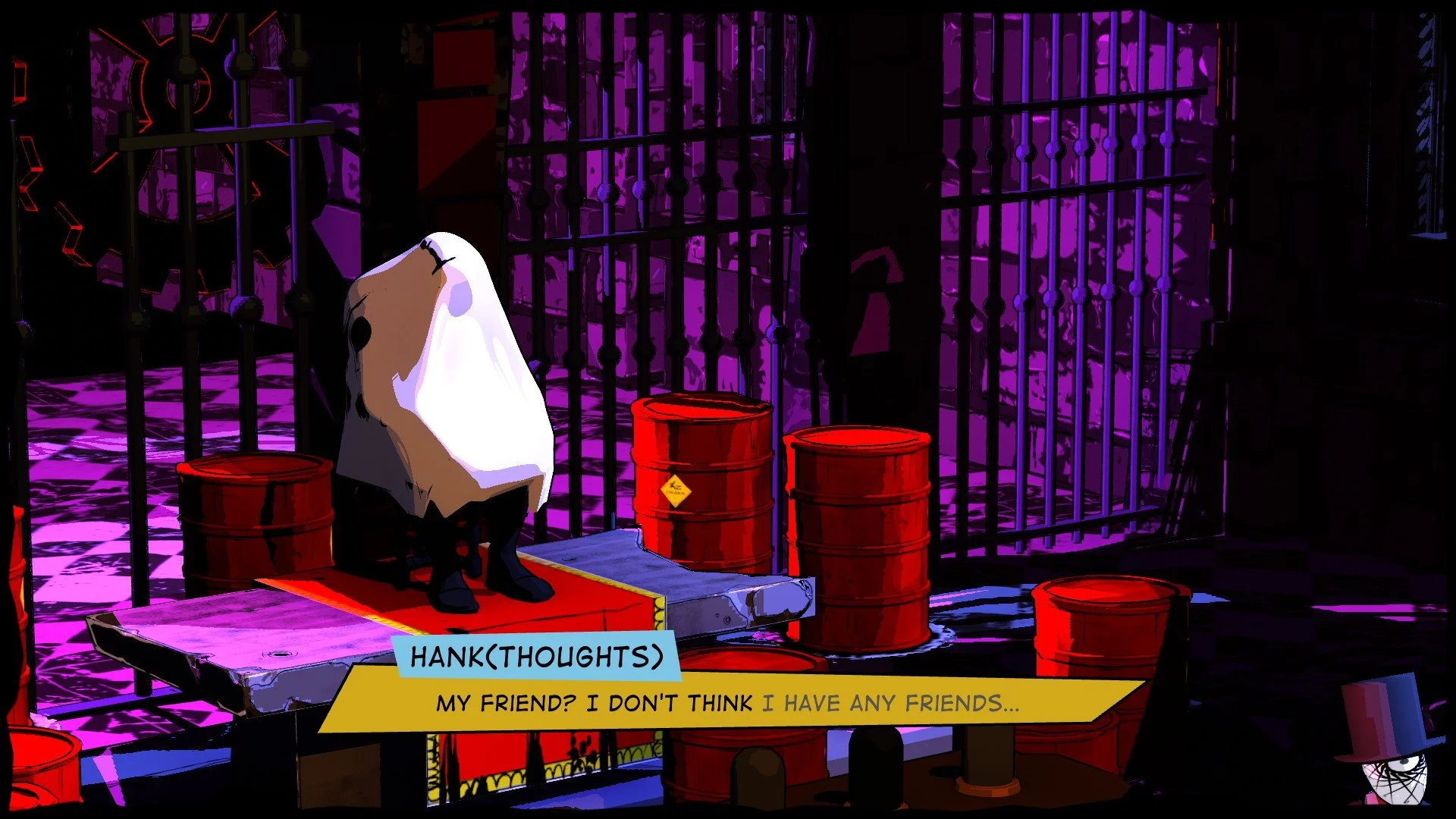 HANK: Drowning On Dry Land is quite brief. It's one main puzzle and cart riding sequence fits a single 10-30 minute session. A neat, highly polished experience, the feeling of playing through a small comic zine uses time itself to produce a distinctly video game short story.